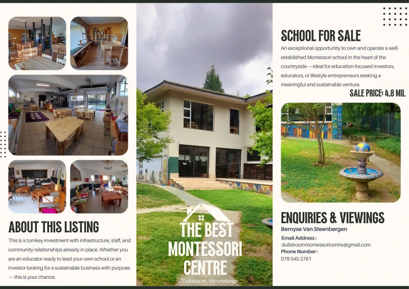 Includes all school assets, furniture, Montessori materials, equipment, 2000 square meter property with double storey building zoned as a school.